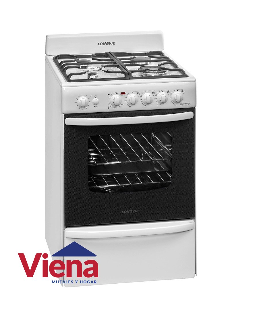 Blanca con rejas de hierro fundido, quemador doble corona, grill eléctrico, timer, termostato y encendido electrónico a una mano.