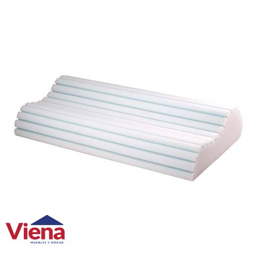 Almohada cervical. Confeccionada con Espuma Ecologica (sistema Cardio) y formato ergonomico. Canales de aireacion. Revestida con tela sabana estampada. Peso 0.465 kg. Medidas: 65 x 35 x 12 a 9 cm.