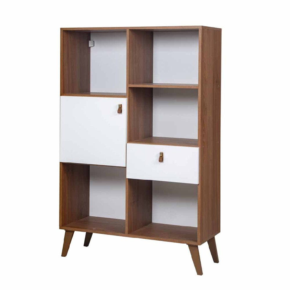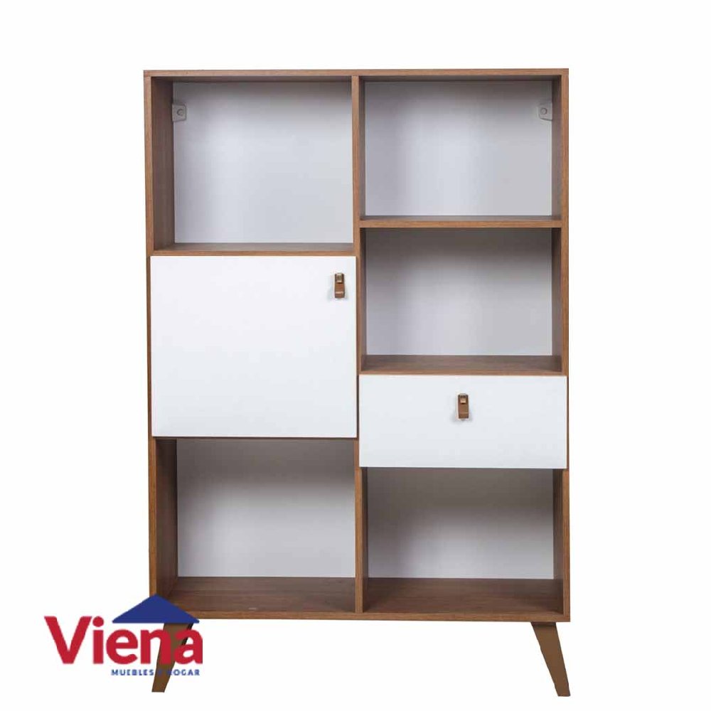Cuenta con 5 espacios abiertos, 1 puerta y 1 cajón, ofreciendo múltiples opciones para guardar y exhibir libros, objetos decorativos o elementos de uso diario.