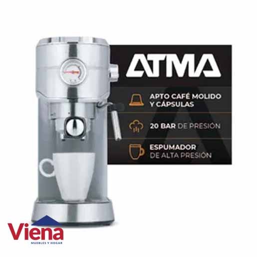 La cafetera Atma CEAT5418P es apta para café molido y cápsulas. Posee reloj indicador de presión, parrilla reguladora de caudal de vapor, corte de erogación automático, calentador de tazas, espumador de alta presión, rejilla desmontable para fácil limpieza y tanque de agua extraíble de 1 litro de capacidad. Incluye accesorio para cápsulas, cuchara dosificadora y prensador de café y botones con indicador luminoso.