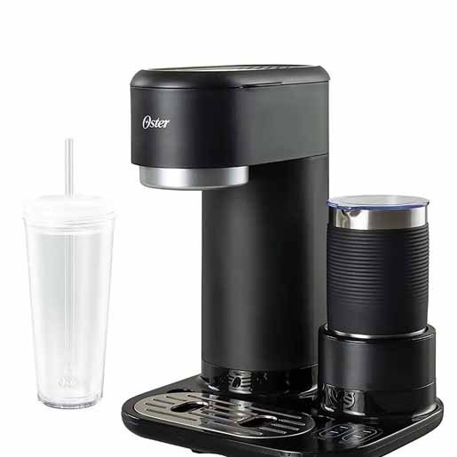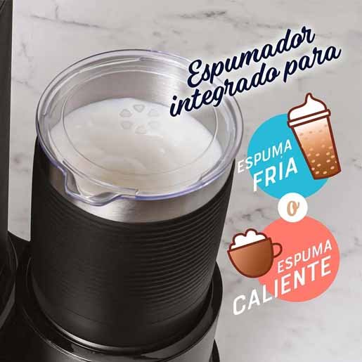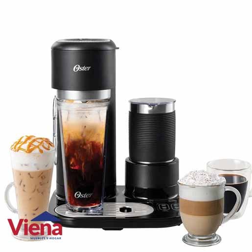 La cafetera express Oster BVSTDC02B 4 en 1 Black es una cafetera que prepara café caliente y frío, lattes y cappuccinos. Cuenta con un espumador de acero inoxidable de 350 ml que permite agregar espuma fría o caliente a las bebidas. La cafetera también incluye una cuchara medidora de café con un compartimento de almacenamiento, un filtro de café y un vaso de 22 oz con pajilla y tapa reutilizables
