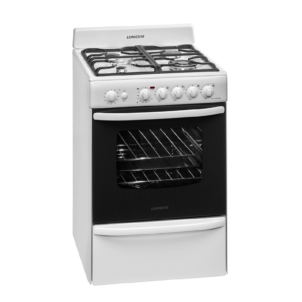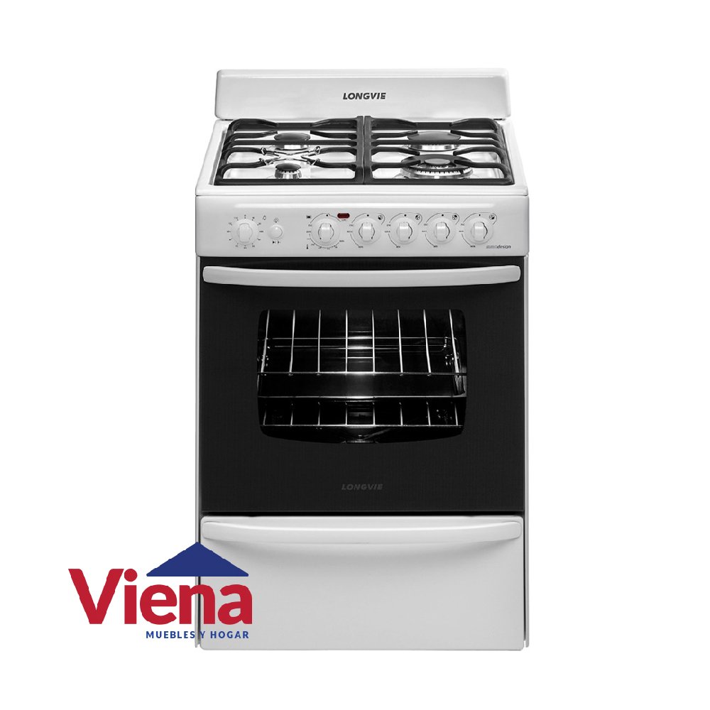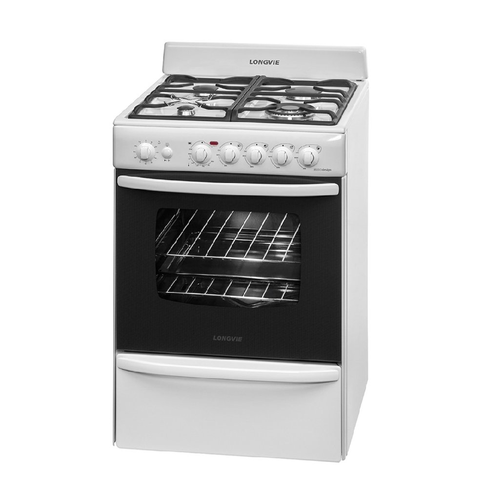 Blanca con rejas de hierro fundido, quemador doble corona, grill eléctrico, timer, termostato y encendido electrónico a una mano.