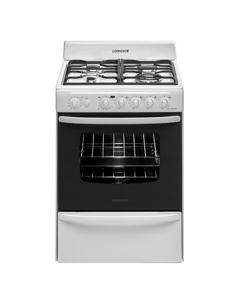 Blanca con rejas de hierro fundido, quemador doble corona, grill eléctrico, timer, termostato y encendido electrónico a una mano.