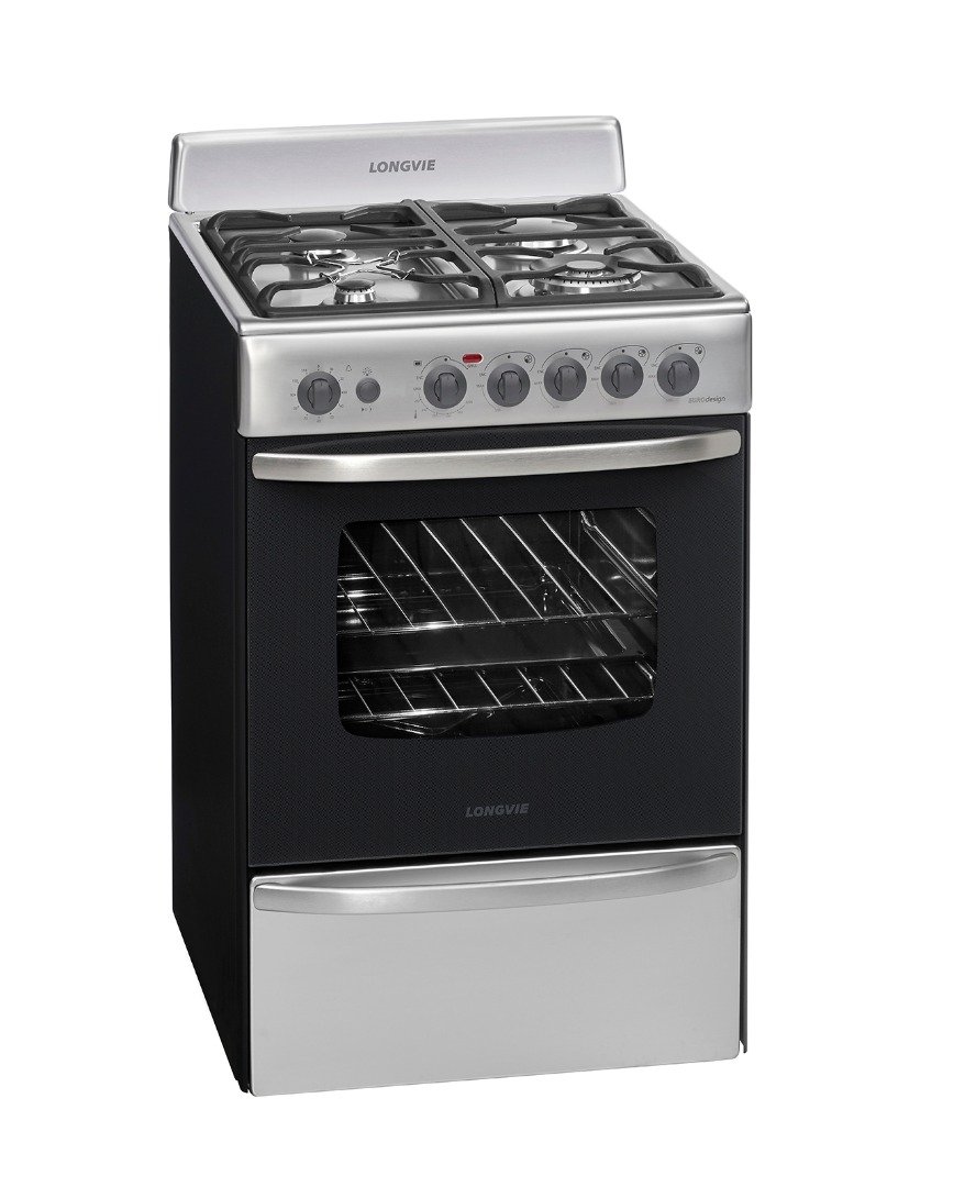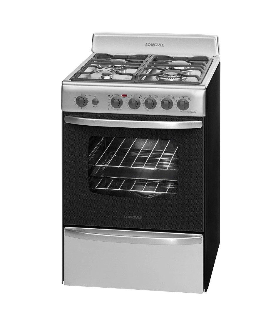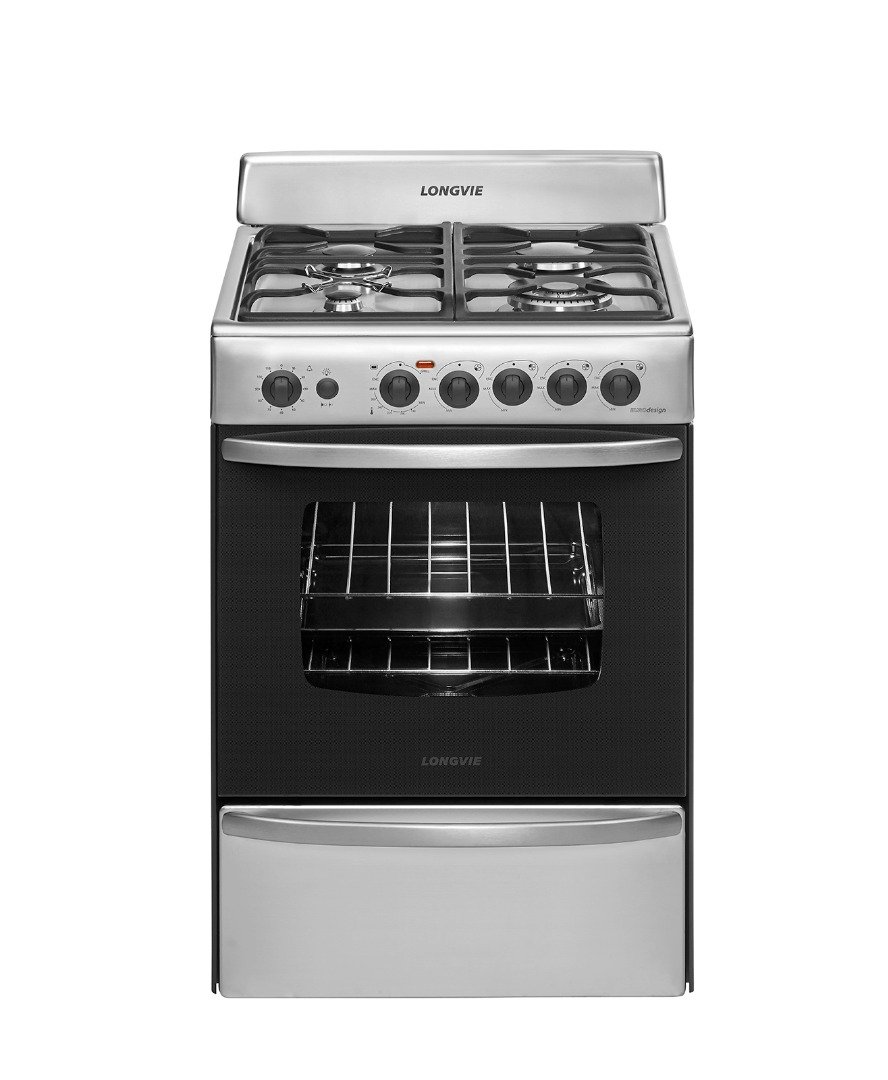 Acero inoxidable con rejas de hierro fundido, quemador doble corona, grill eléctrico, timer, termostato y encendido electrónico a una mano.