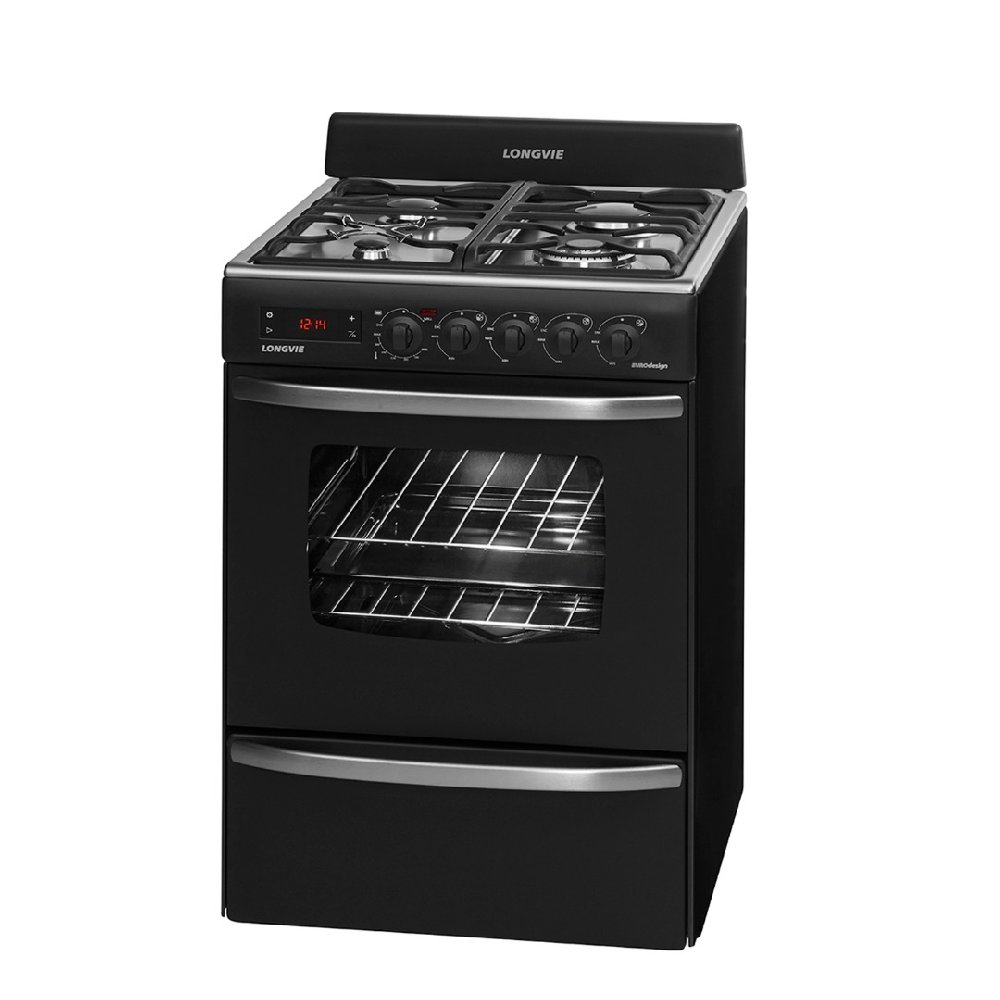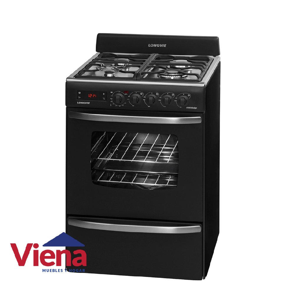 Grafito con rejas de hierro fundido, display con comandos touch, reloj digital programable, quemador doble corona, grill eléctrico, timer, termostato y encendido electrónico a una mano.