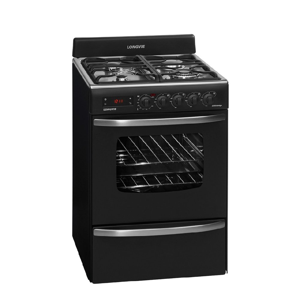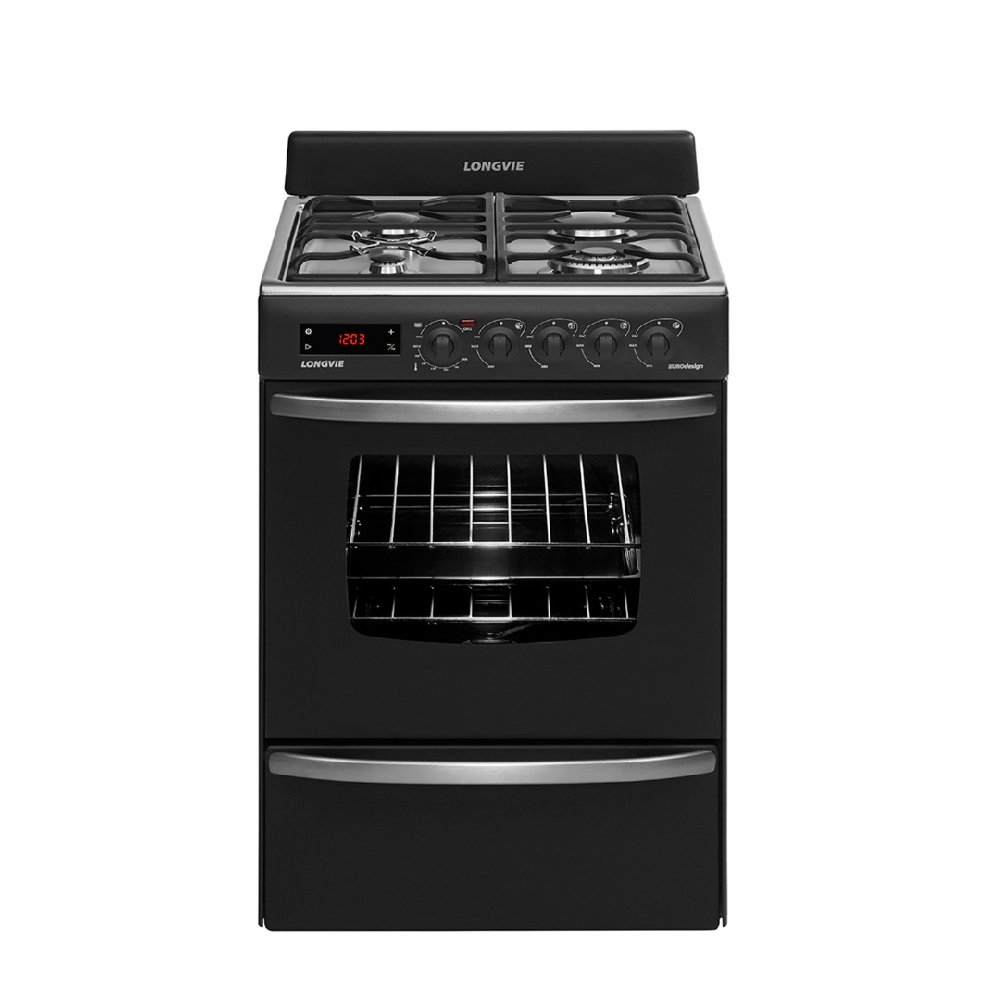 Grafito con rejas de hierro fundido, display con comandos touch, reloj digital programable, quemador doble corona, grill eléctrico, timer, termostato y encendido electrónico a una mano.