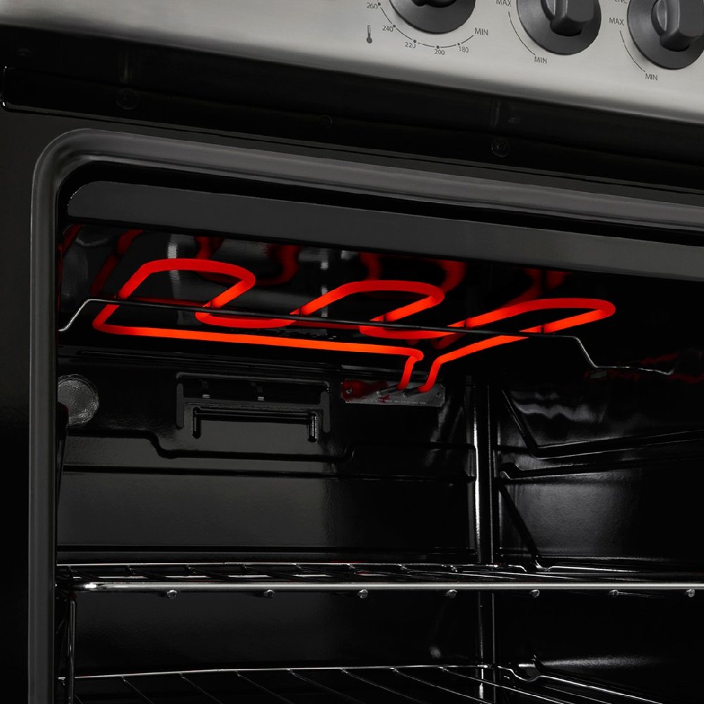 Acero inoxidable con rejas de hierro fundido, display con comandos touch, reloj digital programable, quemador doble corona, grill eléctrico, timer, termostato, encendido electrónico a una mano y vidrio reflex.
