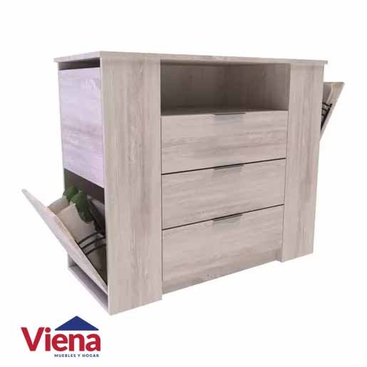 Con unas dimensiones de 111.5 cm de alto por 94 cm de ancho, ofrece una estructura robusta y bien proporcionada. Dispone de tres cajones espaciosos, ideales para guardar ropa, accesorios u otros objetos personales, y dos compartimientos inferiores específicos para zapatos, manteniendo el orden en el espacio.