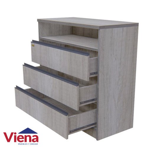 Comoda de dormitorio con 3 cajones. Esta cajonera cuenta con 3 espacios de guardado, regatones antihumedad para conservar lo que se coloque en su interior, correderas telescopicas que permiten un deslizado suave y perfileria de aluminio anodizado en cada cajon. Material: MDP de 15 mm de espesor revestido en melamina de diferentes tonalidades, enchapado en canto melaminico. La tapa superior es de 30 mm de espesor. Cantidad de cajones: 3 cajones frontales, que soportan hasta 25KG de carga cada uno. Medidas de cada cajon: 80 CM de ancho x 40 CM de profundidad x 12 CM de altura.