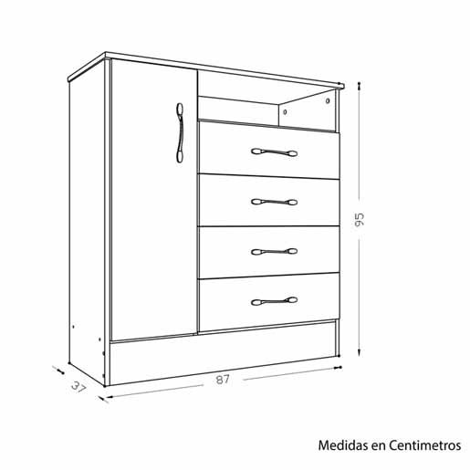 Equipada con 1 puerta y 4 cajones, proporciona un amplio espacio para guardar ropa, accesorios y otros objetos personales de manera ordenada. Sus dimensiones de 87.0 cm de ancho, 95.0 cm de alto, y 37.0 cm de profundidad hacen que esta cómoda sea ideal para diferentes tipos de espacios, desde dormitorios hasta vestidores.