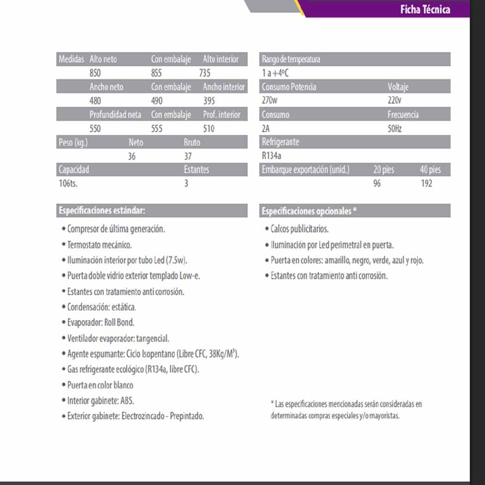 La exhibidora vertical para cervezas cuenta con 106 litros de capacidad; además, posee condensación estática, tres estantes móviles y reja de piso.