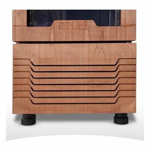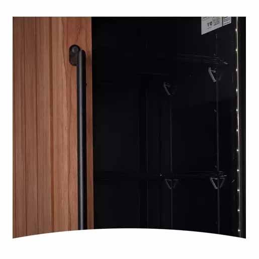 Exterior del gabinete en electrozincado prepintado negro, revestido en madera para un acabado premium.