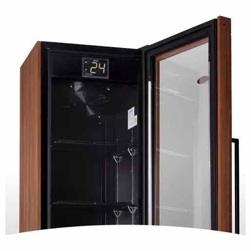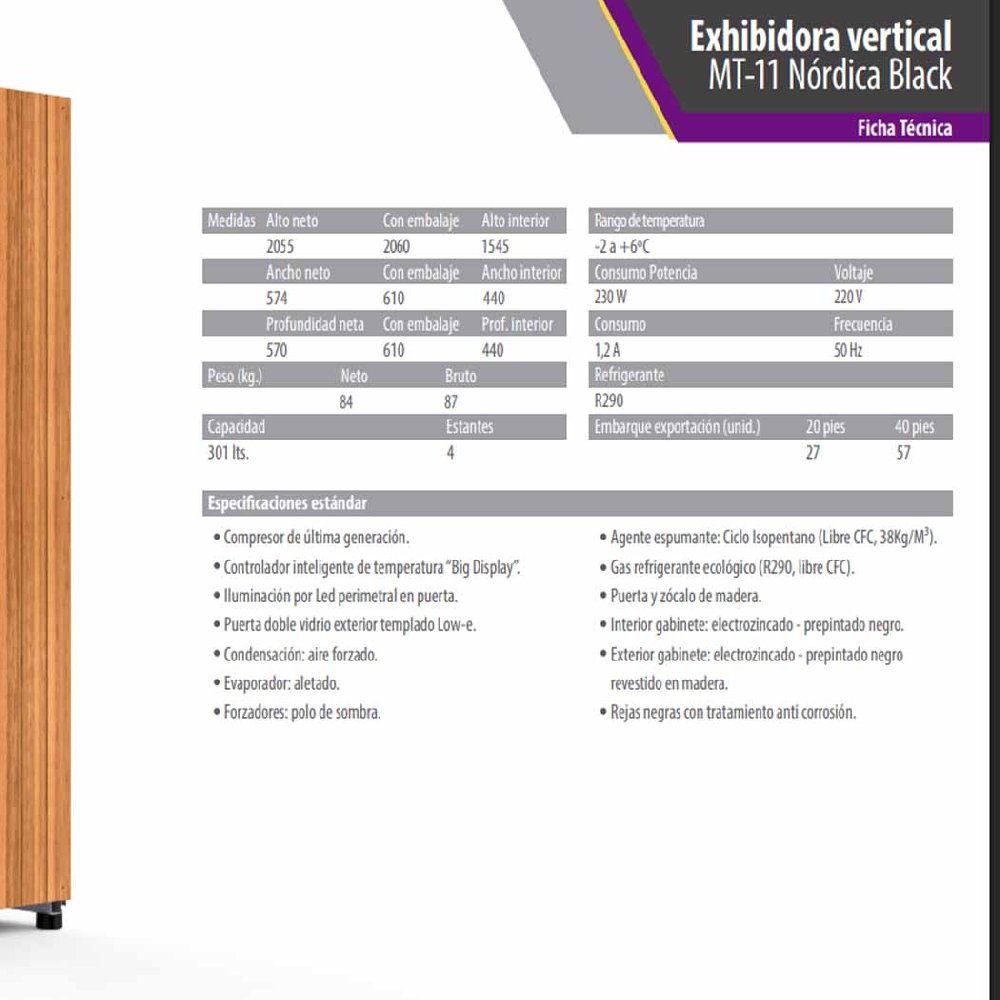 Exhibidora vertical con condensación forzada y avanzado controlador electrónico con indicador de temperatura Big Display. Rango de temperatura subcero ajustable de menos 2°C a 6°C. Cuenta con 4 rejas estantes planas para una óptima organización. Diseño exterior elegante con zócalo y puerta de madera, revestidos en chapa color negro; interior en chapa negra. Utiliza gas refrigerante ecológico R290, que asegura un 15% de ahorro energético.
