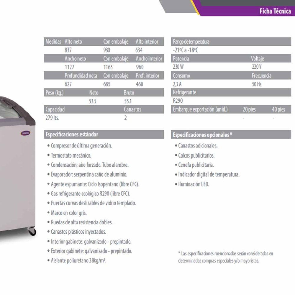 Este freezer exhibidor de 279 litros combina elegancia y funcionalidad en un solo equipo. Su vidrio curvo con plano inclinado mejora la visualización, mientras que la iluminación LED interior realza cada producto con bajo consumo. Incluye 2 canastos organizadores para una exhibición ordenada y práctica. Gracias a sus ruedas dobles de alta resistencia, lo movés con facilidad, y su aislación mejorada te garantiza un 20% de ahorro energético. Una solución inteligente para negocios que buscan vender más y gastar menos.