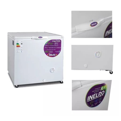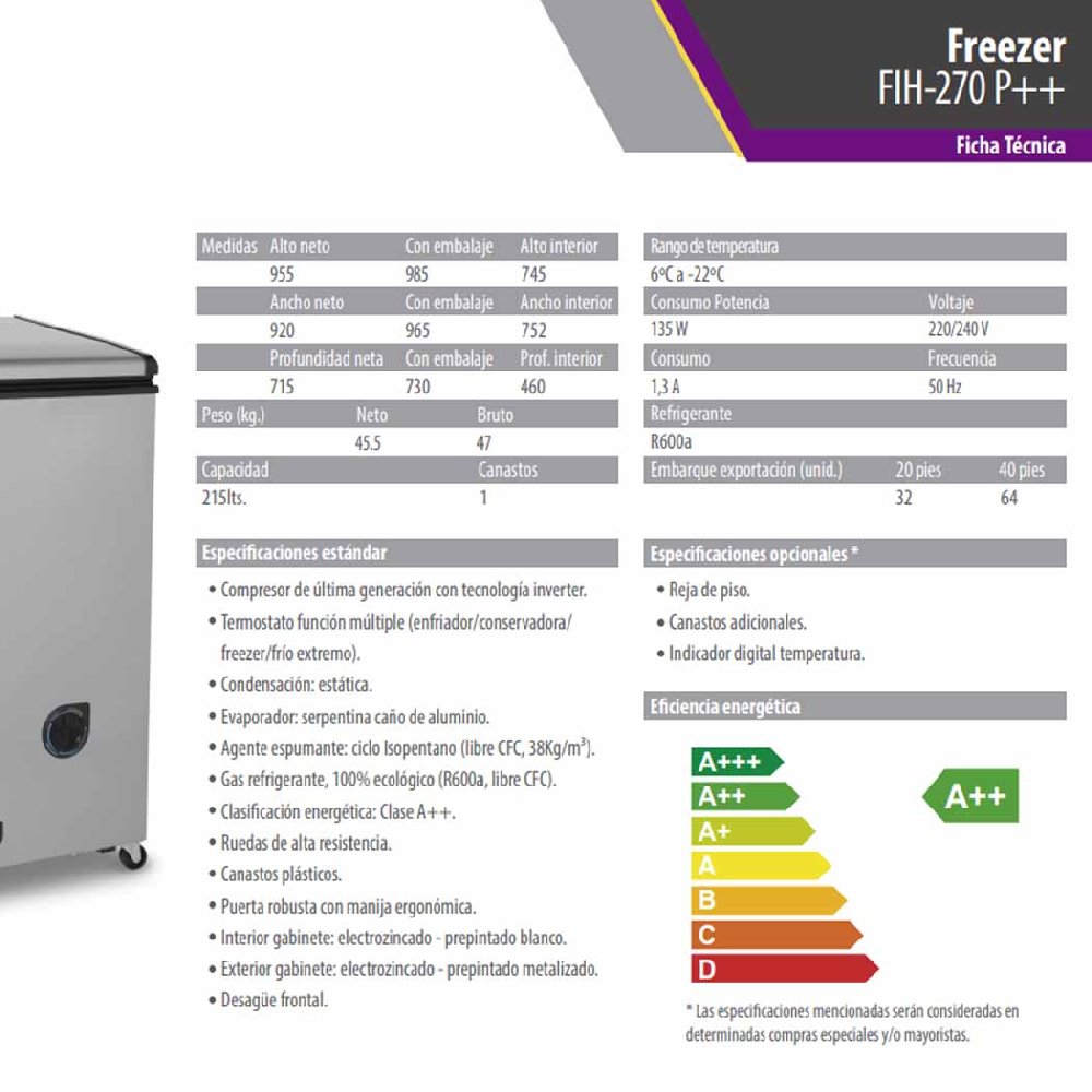 Freezer horixontal. Eficiencia energetica A+. 4 Funciones. Desagote frontal. Ruedas. Compresor de ultima generacion. Termostato funcion multiple (enfriador/conservadora/freezer/frio extremo). Condensacion: estetica. Evaporador: serpentina cano de aluminio. Agente espumante: ciclo Isopentano (libre CFC, 38Kg/m). Gas refrigerante, 100% ecologico (R600a, libre CFC). Clasicacion energetica: Clase A+. Ruedas de alta resistencia. Canastos plasticos. Puerta robusta con manija ergonomica. Interior gabinete: electrozincado - prepintado blanco. Exterior gabinete: electrozinado - prepintado blaco. Desague frontal. Rango de temperatura 6 a 22C. Consumo potencia 90w. Voltaje 220v. Consumo 0.70A. Frecuencia 50Hz.
