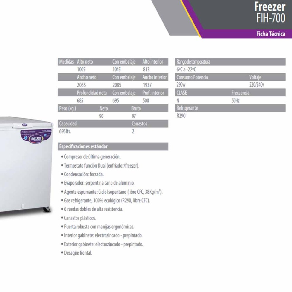 Freezer Inelro FIH-700 R290 3 canastos 695lts horizontal tapa ciega gas r-290