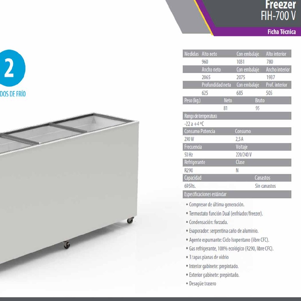 Con 695 litros de espacio real y tapa de vidrio plano recto, este modelo está diseñado para crear una isla de frío funcional y atractiva dentro de tu local. Perfecto para exhibir hasta 32 baldes de producto y adaptarse a distintas necesidades gracias a su termostato dual con función freezer o enfriador. Sus seis ruedas dobles reforzadas permiten moverlo con facilidad, y el uso de gas ecológico R290 garantiza un funcionamiento eficiente y responsable con el medioambiente. Diseño limpio, gran capacidad y versatilidad para comercios que quieren destacarse.Con una capacidad de 695 lts, este modelo puede almacenar hasta 32 BALDES, ofreciendo un amplio espacio para una gran cantidad de productos.