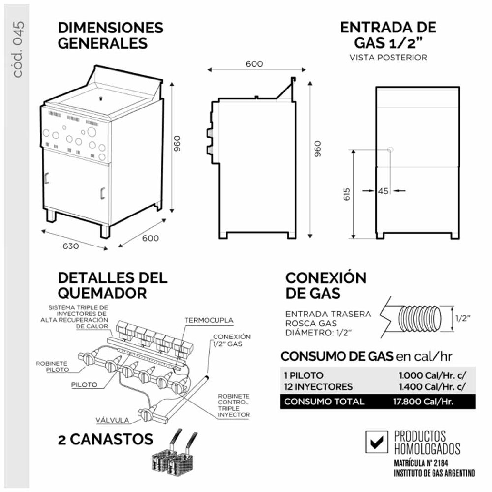 Equipada con 12 inyectores más piloto, todos con comandos individuales, permite un control preciso de la temperatura y una cocción uniforme. Incluye válvula de seguridad y sistema de desagote con llave esférica de bronce para un vaciado práctico y seguro.