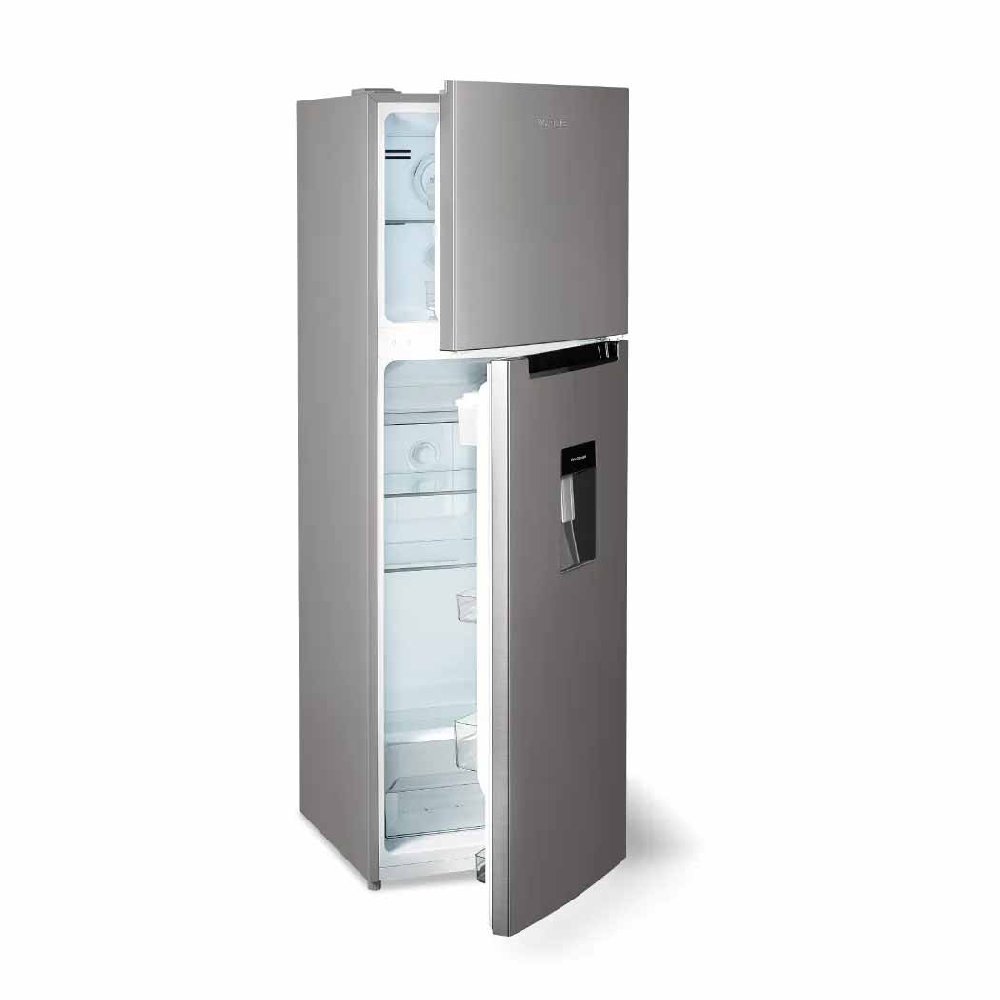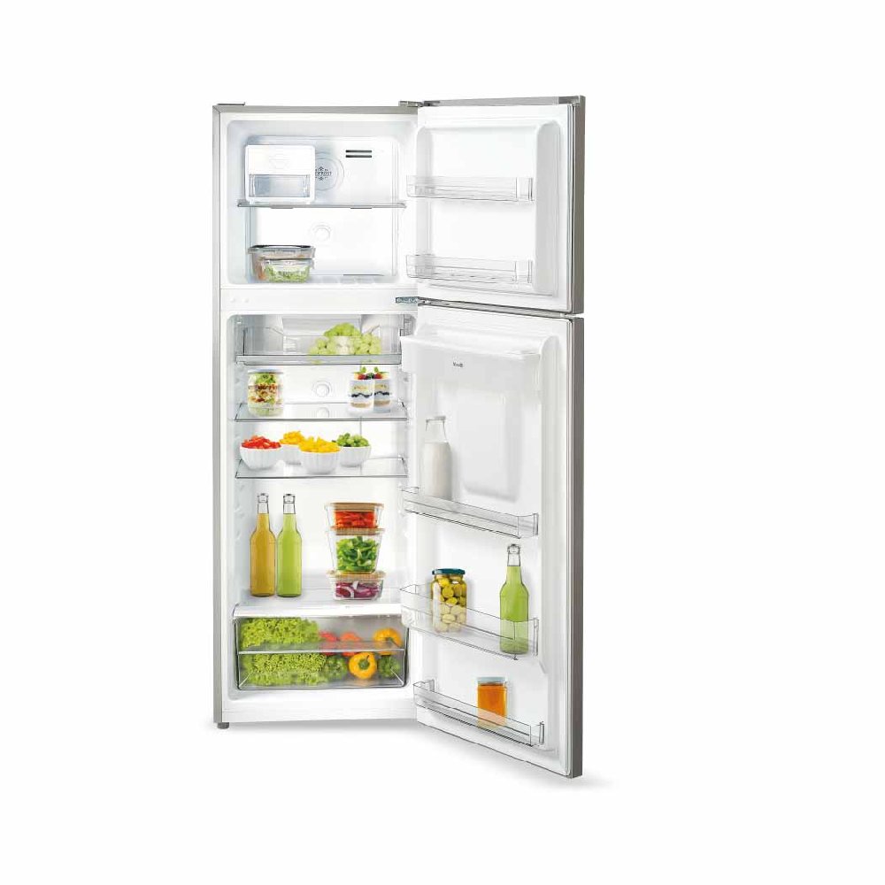Con una capacidad total de 354 litros, combina un amplio espacio de refrigeración con un freezer superior ideal para almacenar congelados sin mantenimiento de descongelado. Su diseño en acabado inoxidable aporta durabilidad y una estética moderna para cualquier cocina. Incluye dispenser de agua, estantes de vidrio templado y luz LED interior.