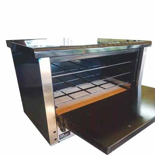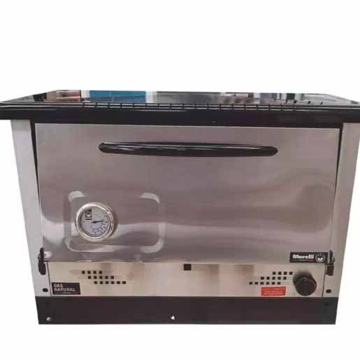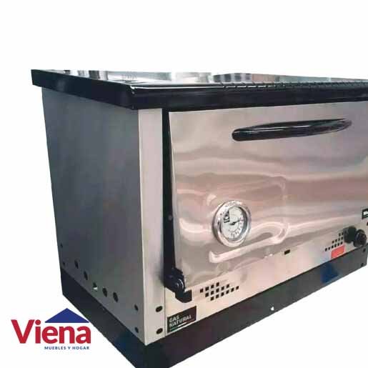 Fabricado con cuerpo de acero inoxidable mate, techo enlozado y piso de tejuelas refractarias, este horno distribuye el calor de manera uniforme, logrando una cocción pareja y profesional. Cuenta con 3 niveles de cocción y un quemador de alto rendimiento que permite alcanzar temperaturas de hasta 300 °C. Incluye válvula de seguridad para operar con tranquilidad y una base de apoyo desarmable que facilita su instalación o traslado.