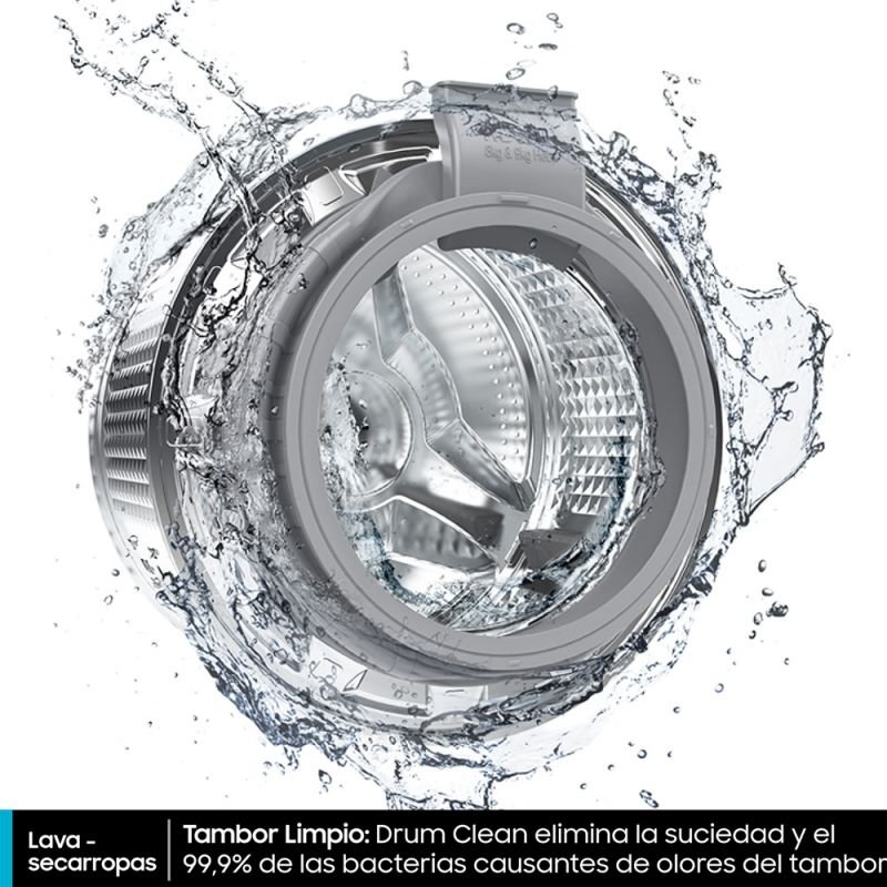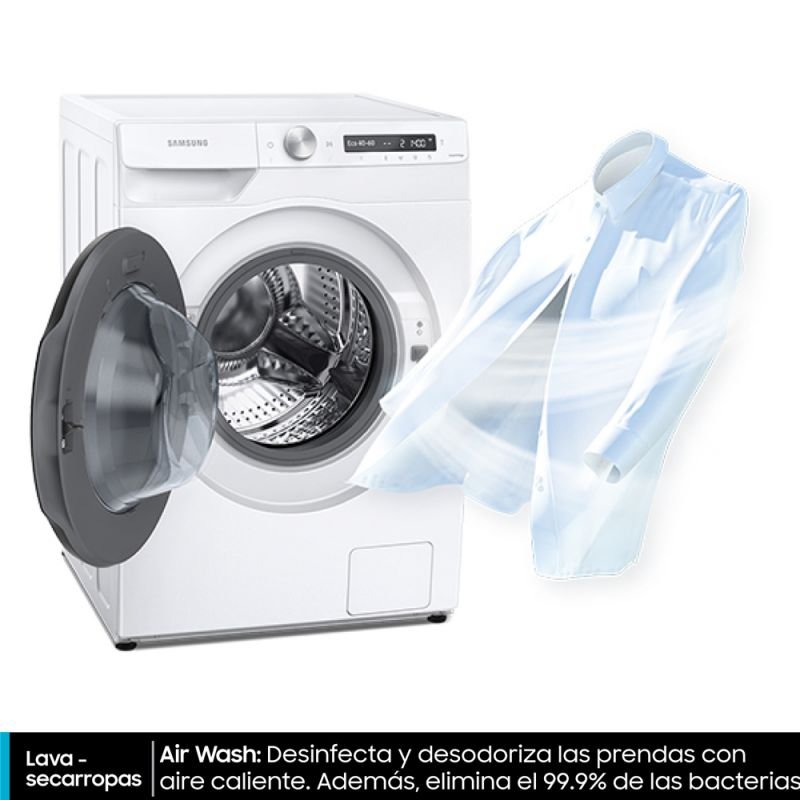 Lavasecarropas Samsung Inverter, cuenta con una capacidad de lavado de 9,5Kg y 6Kg en el secado, IA Control: El patrón IA recuerda tus hábitos de uso para lavar y secar de forma inteligente, función SmartThings: La app proporciona consejos sobre ciclos, planificación y solución de problemas, digital Inverter: rendimiento silencioso, potente y con menos consumo de energía, función Air Wash: desinfecta y desodoriza las prendas con aire caliente, además elimina el 99,9% de las bacterias.
