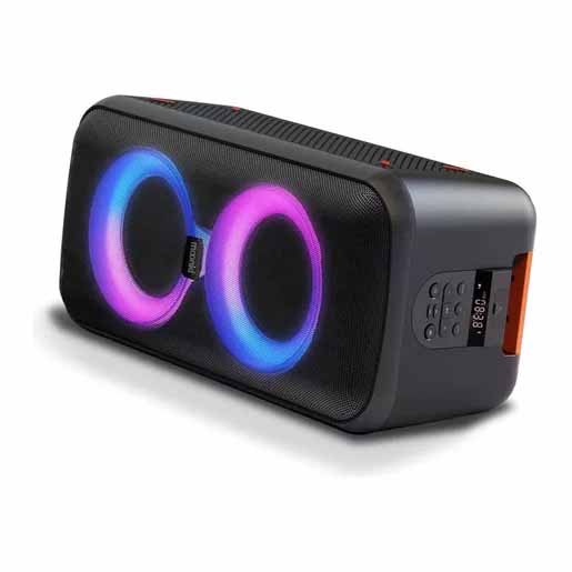 Desde su acabado panel de control de diseño totalmente amigable es posible regular las funciones y efectos de luz LED dinámicos que este Party Speaker dispone.