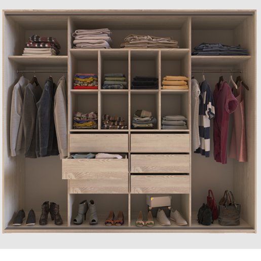 Roperos reflex 4 puertas corredizas. Incluye 6 cajones y 10 estantes. Correderas telescópicas, guía superior e inferior de puertas en aluminio con sistema de rodamiento con amortiguación y de altura regulable. Perfilería lateral de puertas y percheros en aluminio. Fabricado en melamina de alta calidad texturada y lisa en 15mm MDP.