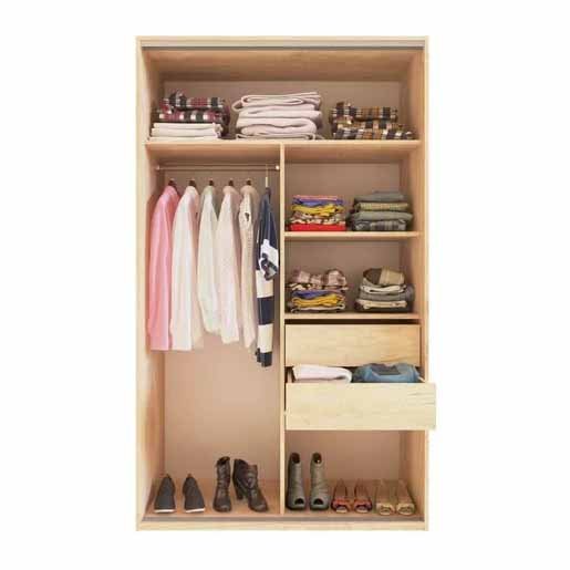 El Ropero Reflex de 2 puertas corredizas y 2 cajones con 4 estantes internos redefine la organización. Fabricado en melamina de alta gama de 15mm MDP, incluye correderas telescópicas, guía superior e inferior, tiradores de puertas y perchero en aluminio anodizado, aportando un toque de sofisticación. Además, sus ruedas inferiores con amortiguación facilitan su desplazamiento, convirtiéndolo en el mueble perfecto para cualquier habitación.