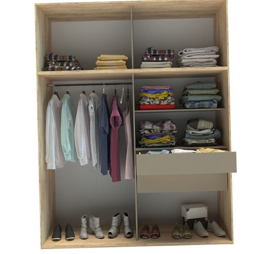 Ropero Duo con baulera, 4 puertas corredizas. Baulera de 65cm de altura. 2 cajones internos con guias telescopicas. Manijon, guias y perchero de aluminio. Melamina de 15mm.