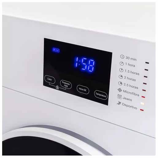 Cuenta con un display LED y función de inicio diferido, permitiendo programar el funcionamiento según tu rutina. Incluye traba de seguridad y ciclo de ventilación para el cuidado de prendas delicadas.