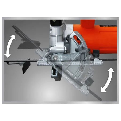 Guia laser incorporada permitiendo un corte mas preciso y facil.*Regulacion de profundidad de 1 mm a 70 mm.*Base de aluminio regulable de 90º a 45º.