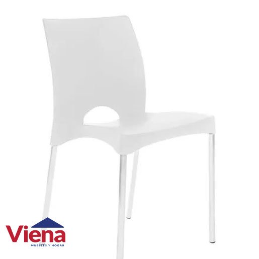 Sillas con asiento de plástico blanco y patas metálicas, al ser apilables y muy livianas facilitan el traslado y permiten ahorrar espacio. Todos nuestros productos plásticos son fáciles de limpiar, los materiales que lo componen son totalmente reciclables.