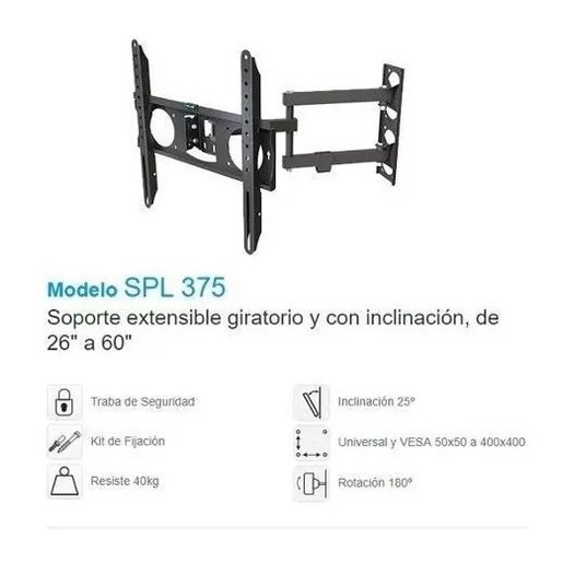 Ideal para pantallas LED y LCD, permite ajustar la inclinación, rotación y distancia respecto a la pared, ofreciendo una experiencia de uso personalizada y cómoda. Gracias a su estándar VESA universal (de 50x50 a 400x400), es compatible con una amplia variedad de televisores y monitores.