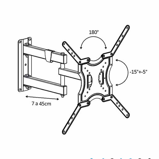 El Nakan SPL-578E es un soporte de pared versátil y resistente, ideal para pantallas de 23" a 75". Diseñado para ofrecer máxima flexibilidad de movimiento, permite inclinar la pantalla entre -5° y +15°, girarla hasta 180° y extenderla hasta 50 cm desde la pared, lo que lo convierte en una opción ideal para optimizar el ángulo de visión en cualquier ambiente.