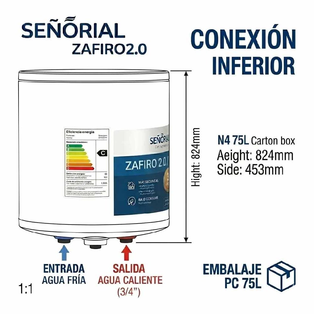 El termotanque eléctrico Señorial Zafiro 2.0 de 75 litros es una solución eficiente y confiable para el suministro de agua caliente en el hogar. Diseñado para ofrecer un rendimiento constante, combina tecnología avanzada con materiales de alta calidad que garantizan durabilidad y confort diario.