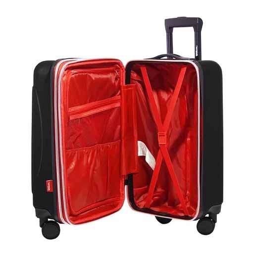 El interior de la valija está completamente forrado en poliéster, ofreciendo un toque suave y lujoso para proteger tus pertenencias. Incluye un compartimiento con una funda de cierre para organizar artículos pequeños o documentos importantes. Las cintas elásticas sujetan firmemente el contenido de la valija, evitando el movimiento de los objetos durante el viaje. Además, un cierre superior con un bolsillo de red sirve como tapa para el compartimento, permitiendo una visibilidad rápida y un acceso organizado a tus artículos esenciales.